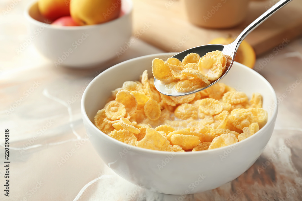Tableau sur toile Eating of healthy cornflakes with milk from bowl on table, closeup