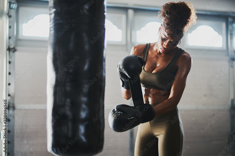 Tableau sur toile african american woman covered in sweat from boxing punching bag taking off glov