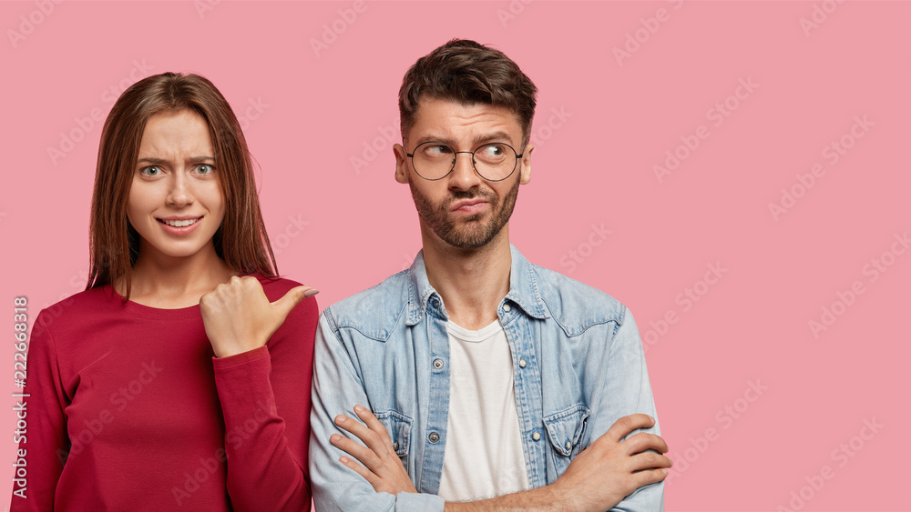Tableau sur toile Hey, look at this lazy guy! Indignant European woman with dark hair, points with