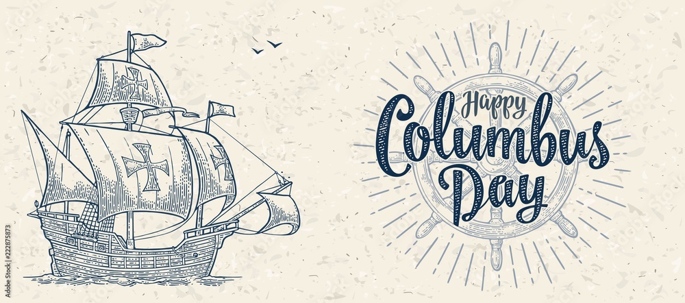 Tableau sur toile Sailing ship floating on the sea waves. Caravel Santa Maria.