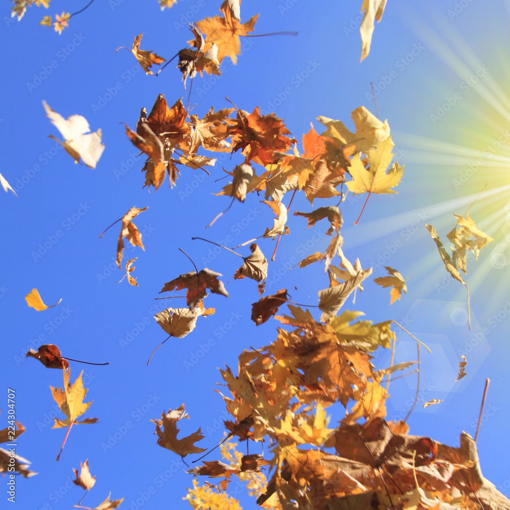 Tableau sur toile flying leaves in the air against blue sky in fall