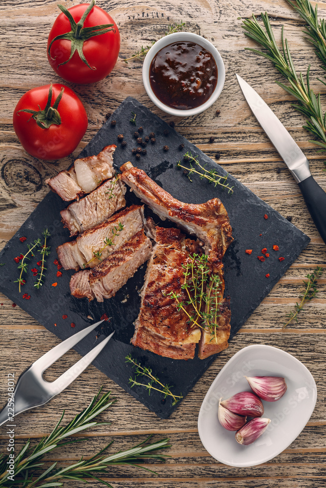 Tableau sur toile Sliced grilled veal chop with vegetables on rustic table