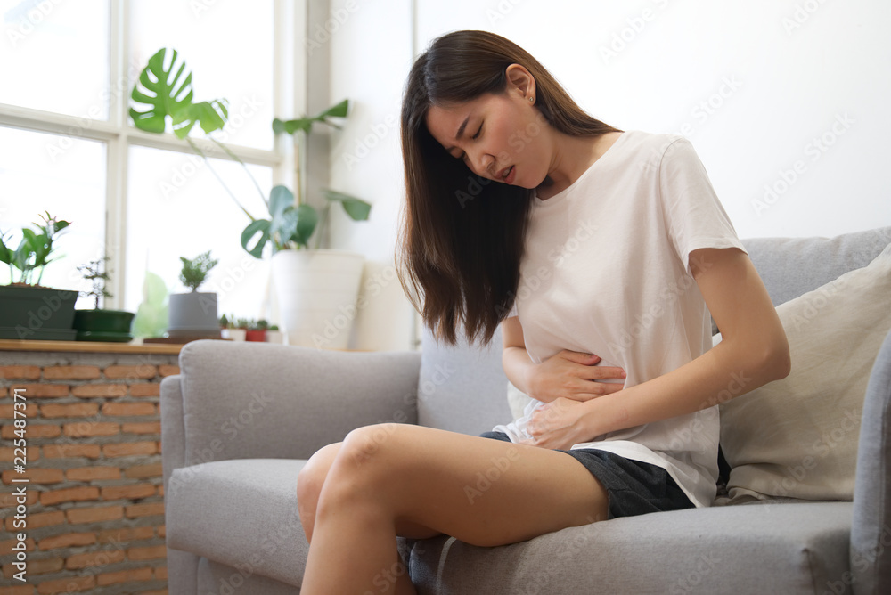 Tableau sur toile Asian girl having period is sitting on sofa and feeling much of painful on her stomach with unknown reason