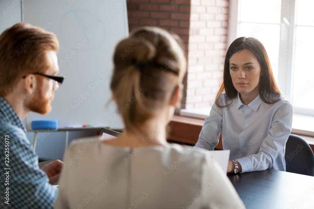 Tableau sur toile Serious attentive female boss listening to employees reporting about work result
