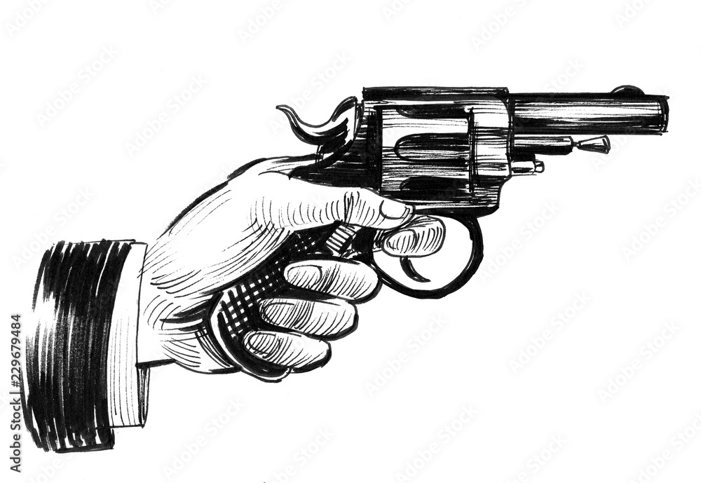 Tableau sur toile hand holding a revolver gun. Ink black and white illustration