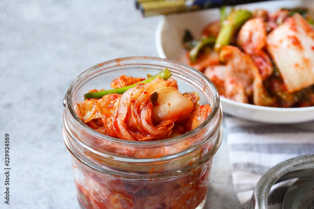 Tableau sur toile Homemade kimchi in a jar close up, selective focus