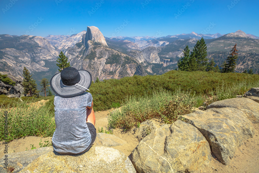 Tableau sur toile Traveler woman looking panorama at Glacier Point in Yosemite National Park, California, USA
