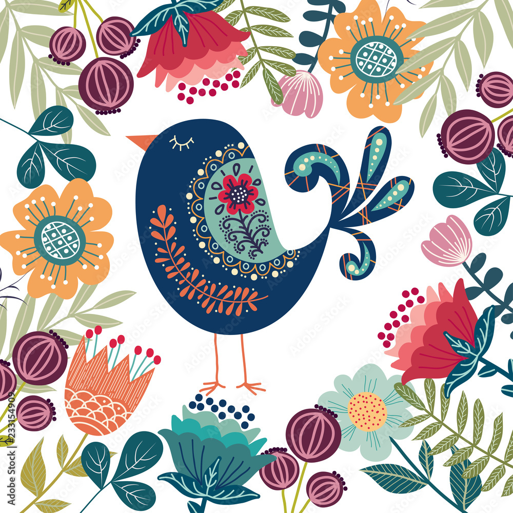 Tableau sur toile Art vector colorful illustration with beautiful abstract folk bird and flowers
