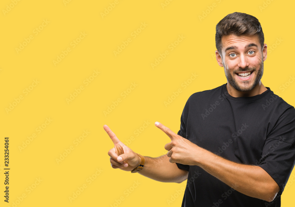 Tableau sur toile Young handsome man over isolated background smiling and looking at the camera pointing with two hands and fingers to the side
