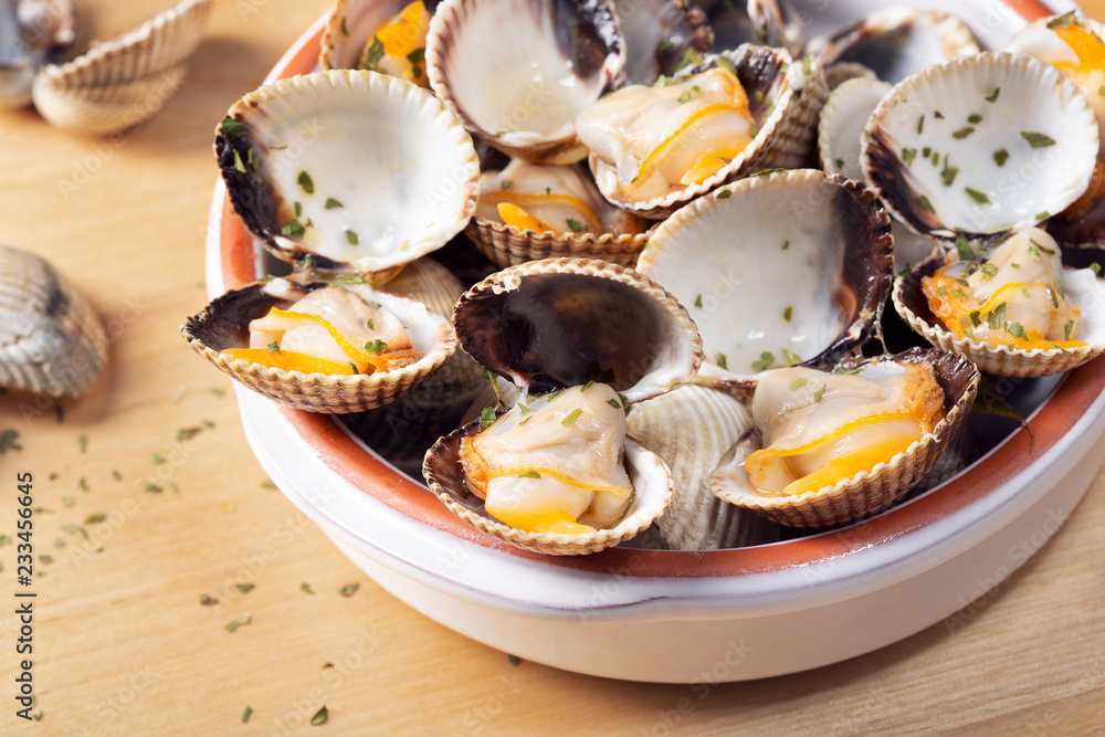 Tableau sur toile Cooked cockles Tasty appetizer. Steamed cockles Close up
