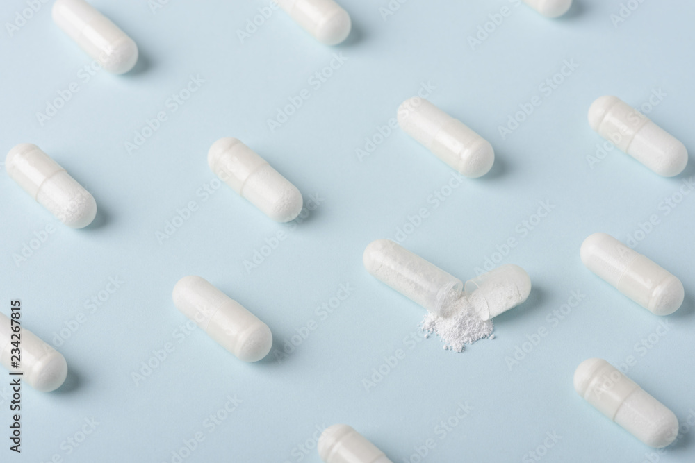 Tableau sur toile Pills pattern with one capsule open and white powder spilling over blue backgrou