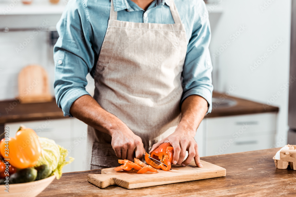 Tableau sur toile mid section of young man in apron cutting fresh pepper in kitchen