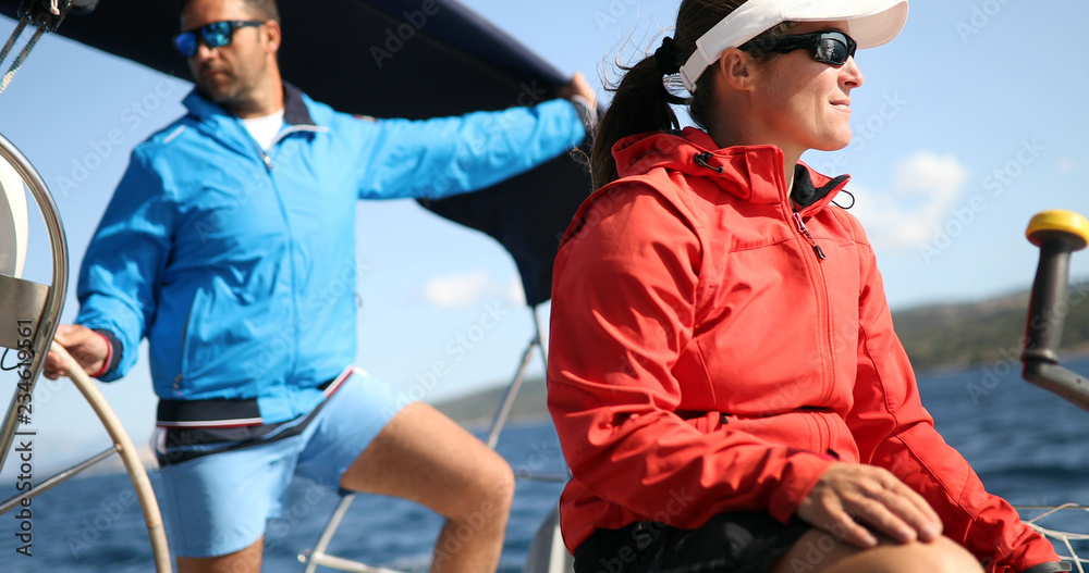 Tableau sur toile Couple enjoying sunset from the deck of the sailing boat
