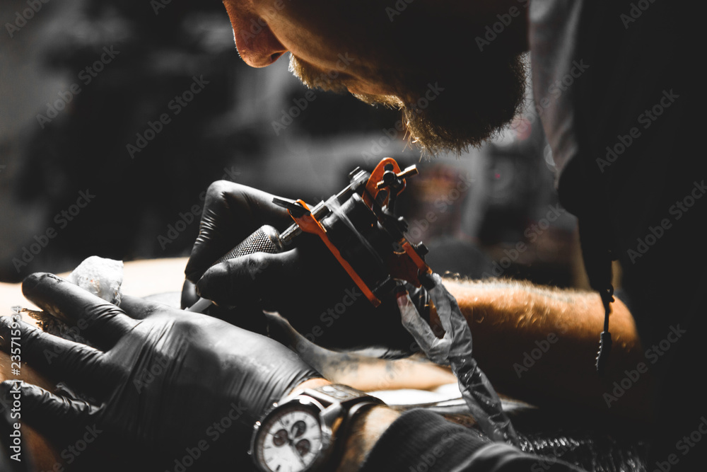 Tableau sur toile The tattoo artist creates a picture on the body of a man