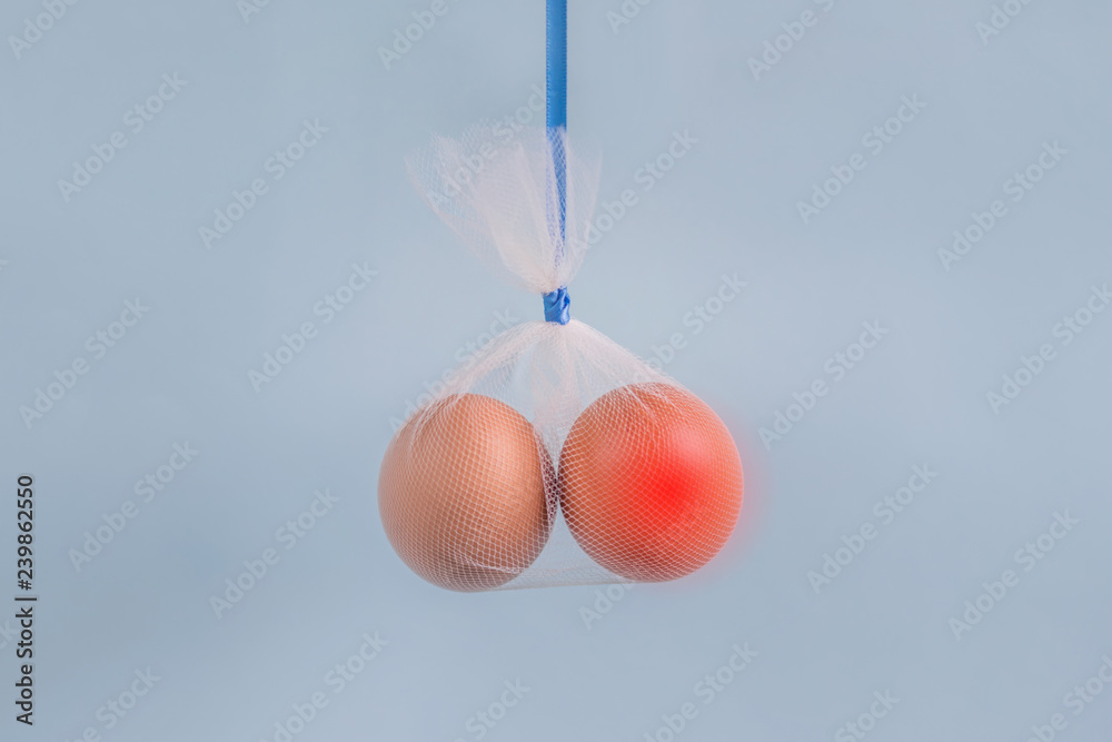 Tableau sur toile Testicular cancer concept: eggs in a tulle bag on a blue background one egg red