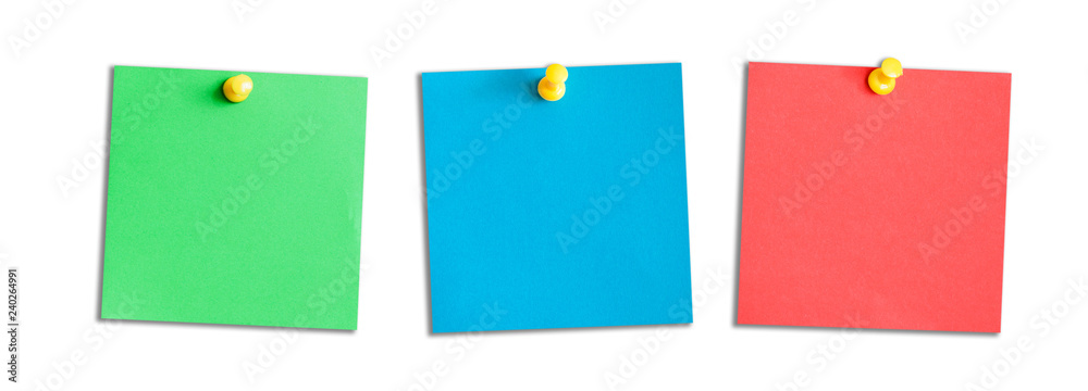 Tableau sur toile Three green, blue and red memo reminder cards isolated on white.