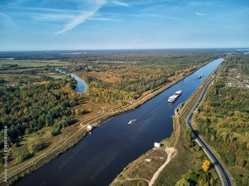 Tableau sur toile Sluice on the chanel Moscow-Volga, aerial view, dubna, dvitrov