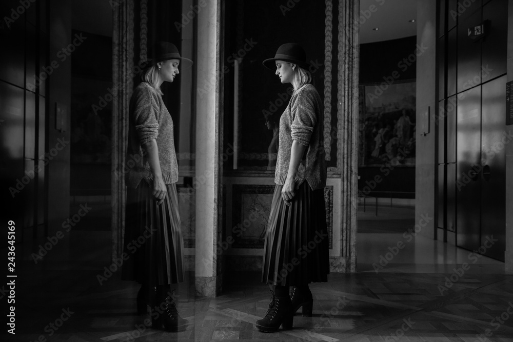 Tableau sur toile Self reflection portrait of beautiful young girl in mirrored window