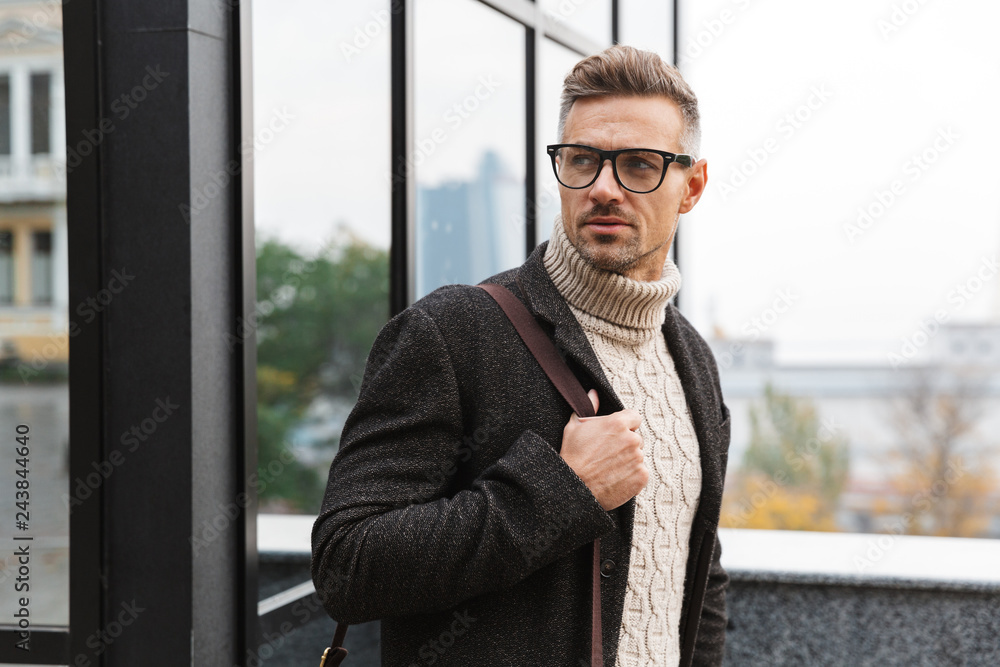 Tableau sur toile Portrait of stylish man 30s wearing eyeglasses, walking through city street near