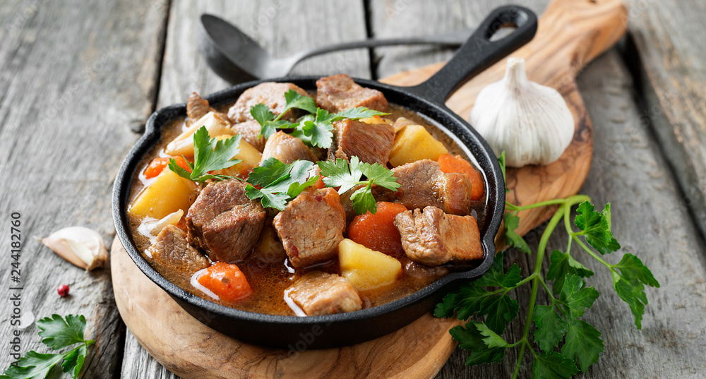 Tableau sur toile Meat stewed with potatoes, carrots and spices in iron pan on wooden background