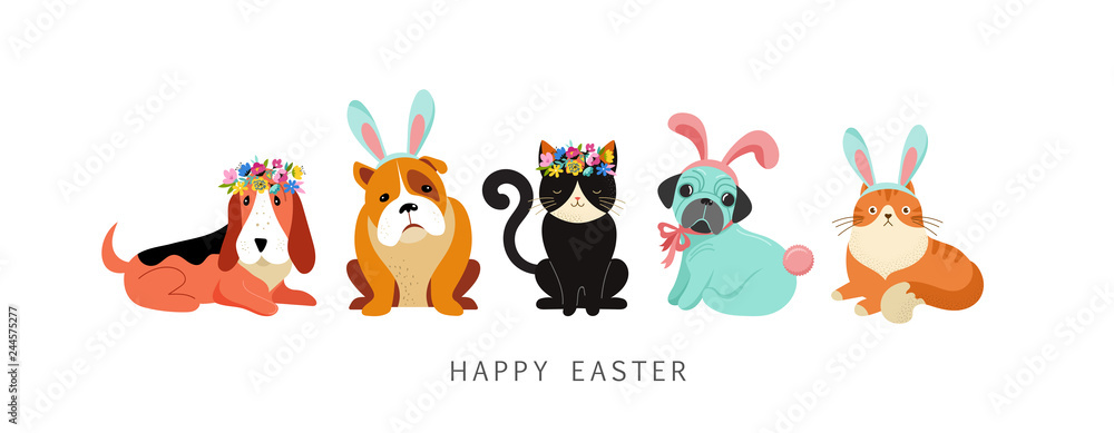Tableau sur toile Happy Easter card, dogs and cats wearing bunny costumes, holding basket with egg