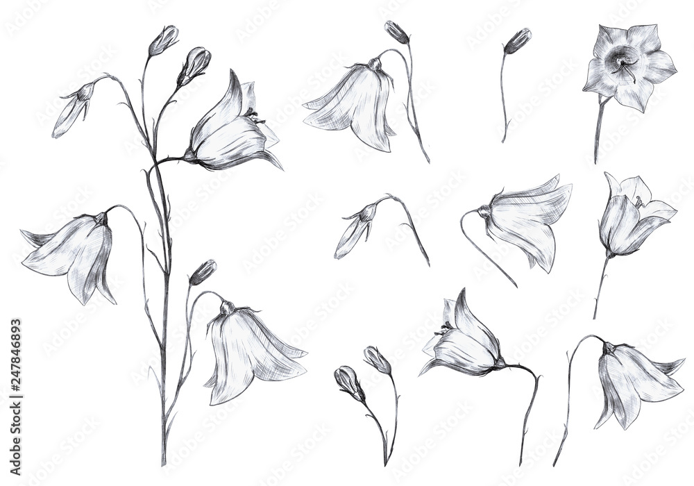 Tableau sur toile Hand drawn floral set of isolted objects with graphic bluebell flowers and buds