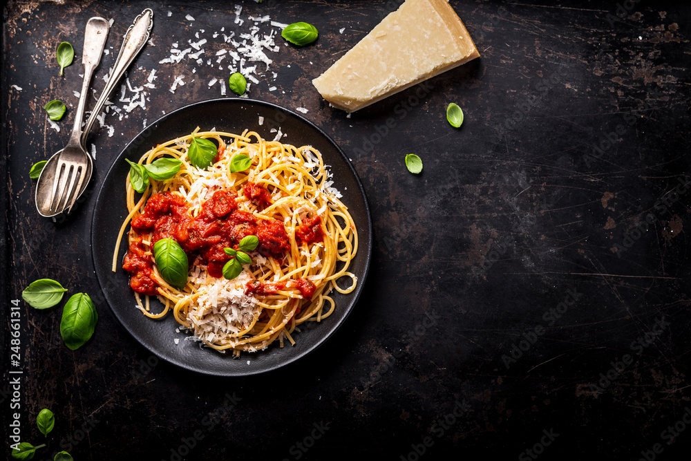 Tableau sur toile delicious appetizing classic spaghetti pasta with tomato sauce, parmesan