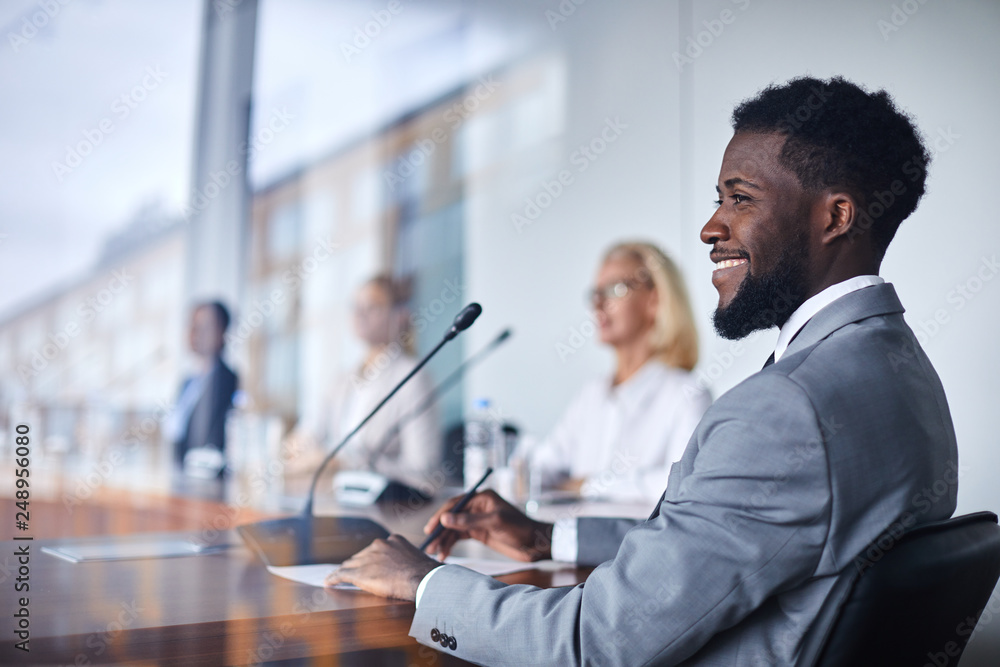 Tableau sur toile Happy African-american delegate in suit and his colleagues sitting by table and