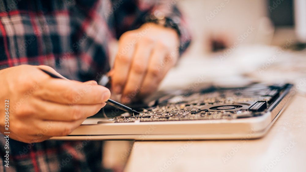 Tableau sur toile Electrician engineer technician repair faulty laptop computer in electr service