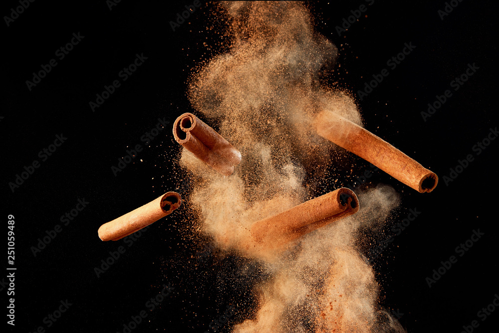Tableau sur toile Food explosion with cinnamon sticks and powder