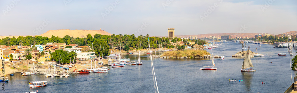 Tableau sur toile Assuan mit Blick auf Elephantine mit Segelschiffen in Ägypten am Nil ein Panorama