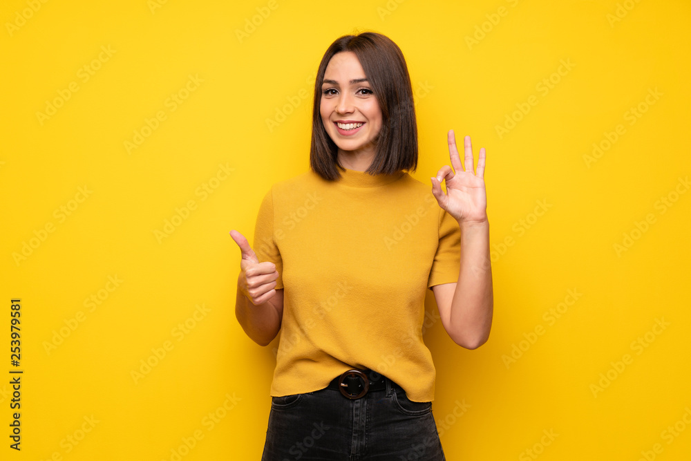 Tableau sur toile Young woman over yellow wall showing ok sign with and giving a thumb up gesture