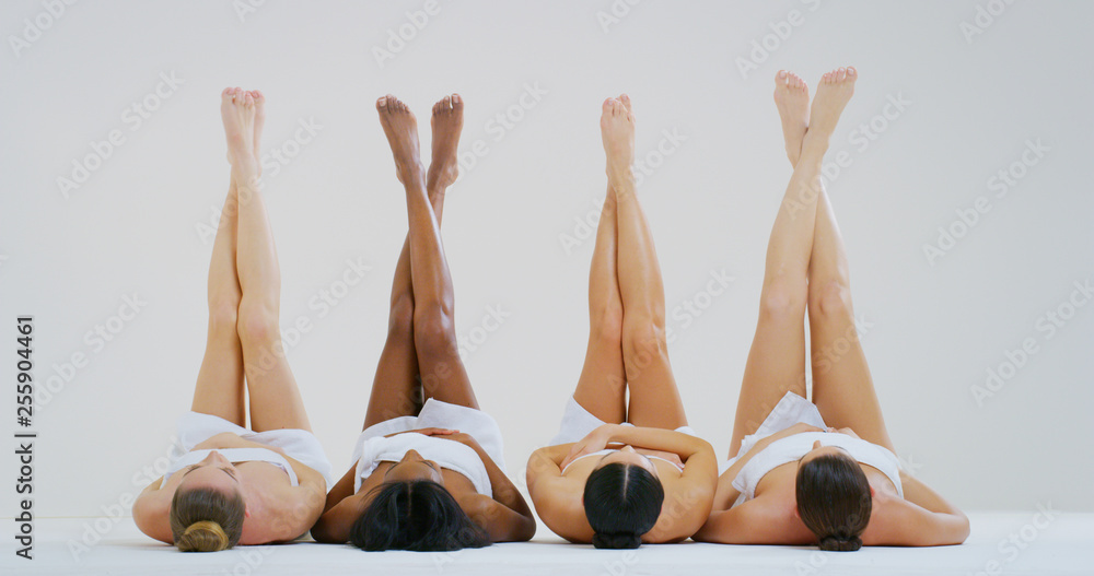 Tableau sur toile Portrait of beautiful young women of different ethnicities with perfect firm and slim bodies with hairless soft and silky legs crossed isolated on a white background