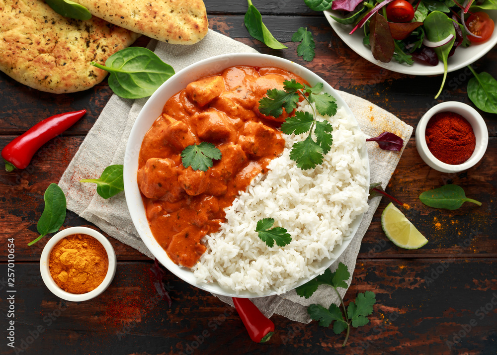 Tableau sur toile Chicken tikka masala curry with rice and naan bread