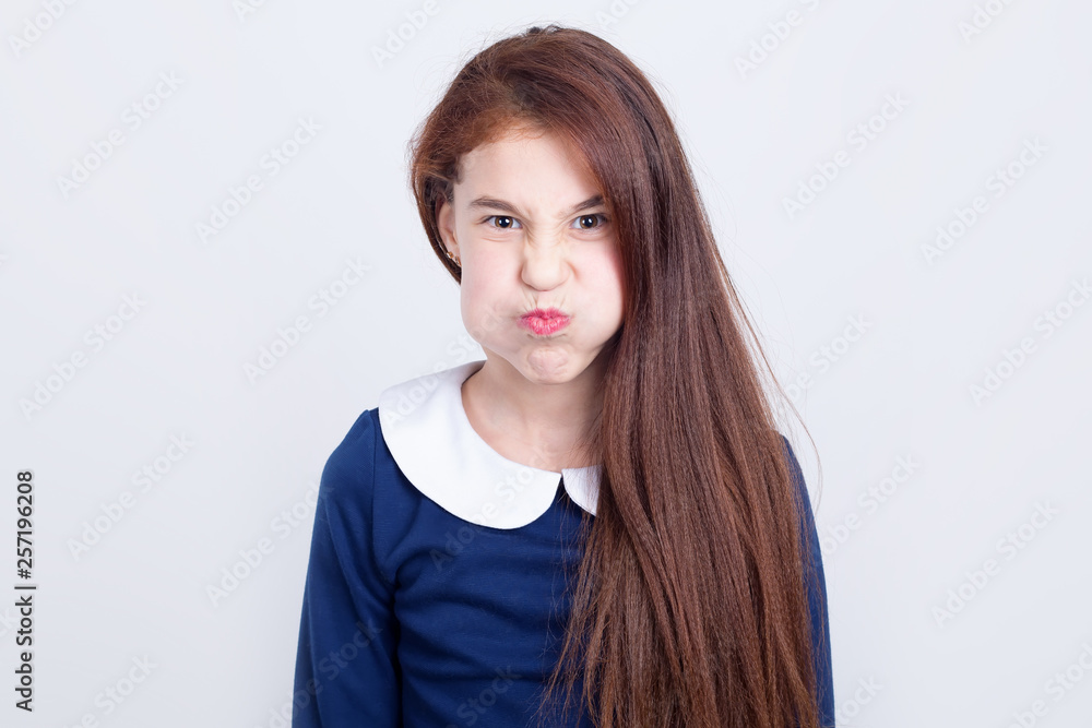 Tableau sur toile Portrait of a girl who puffed up her cheeks in anger and displeasure while standing on a light background