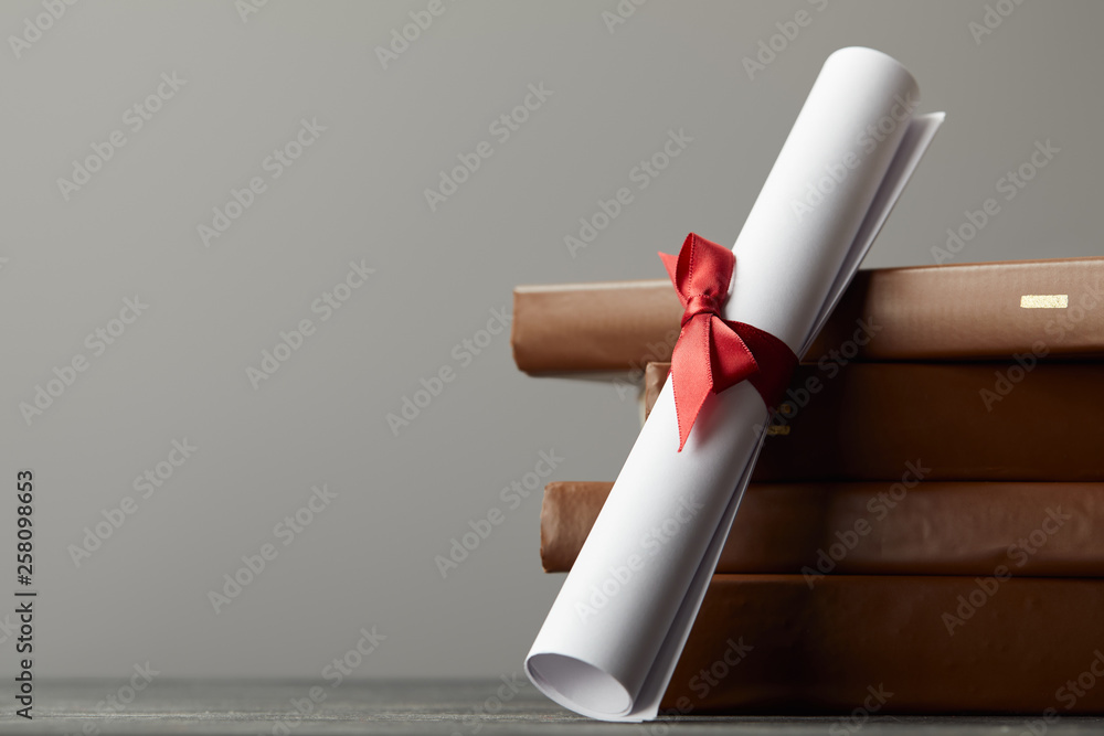 Tableau sur toile Brown books and diploma with red ribbon isolated on grey
