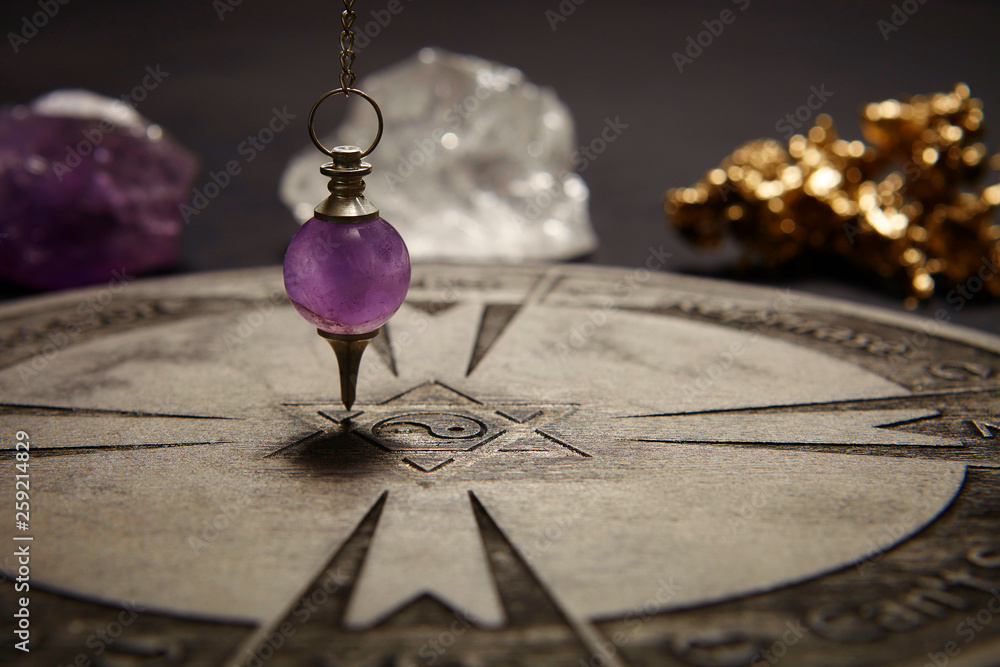 Tableau sur toile Properties of fortune telling - wooden spiritual chart and pendulum