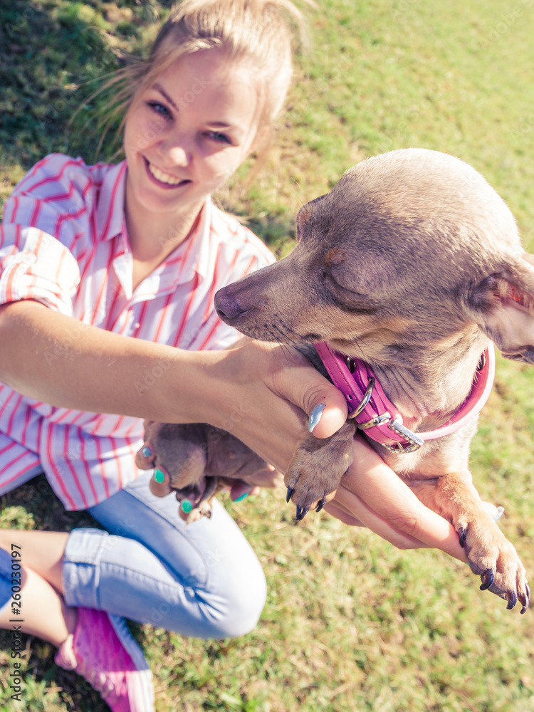 Tableau sur toile Woman playing pinscher ratter dog outside