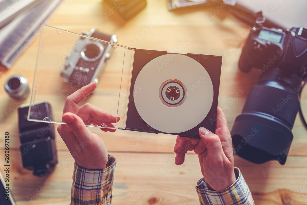 Tableau sur toile Photographer holding dvd disc with archived photos