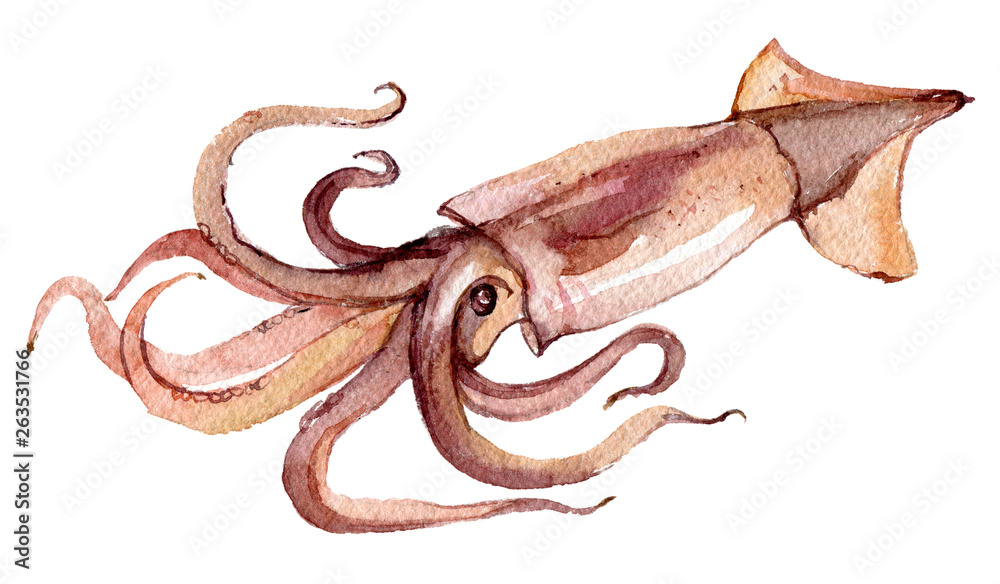 Tableau sur toile Squid isolated on white background, watercolor illustration