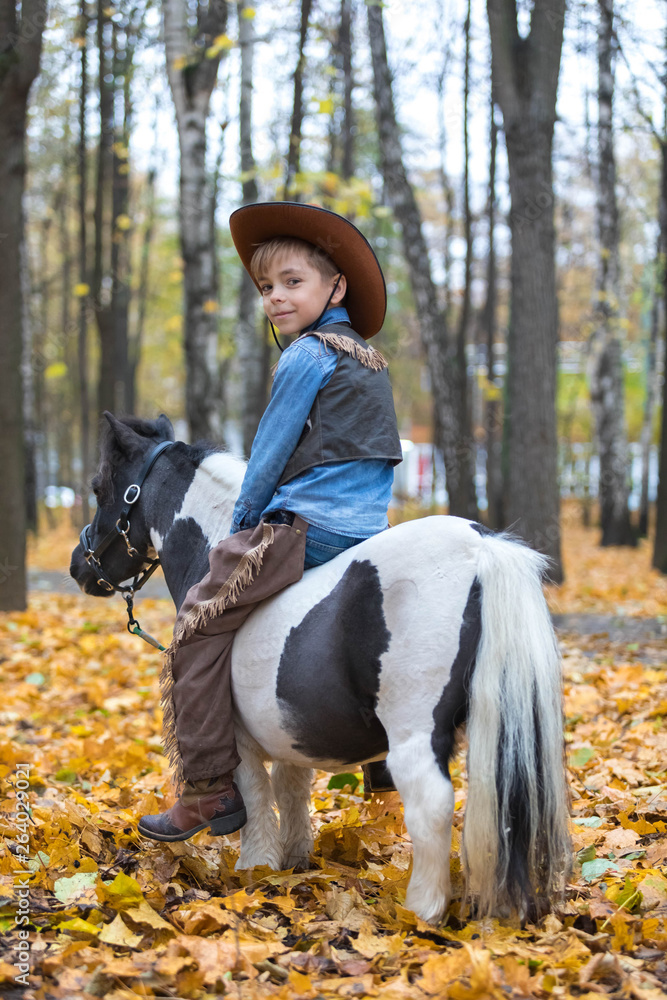 Tableau sur toile Caucasian boy in the cowboy's suit on a pony horse astride in the autumn forest