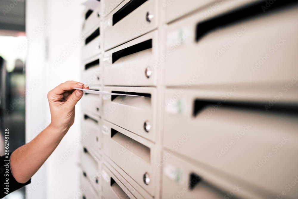 Tableau sur toile Sending postcard. Close-up of woman's hand posting a letter.