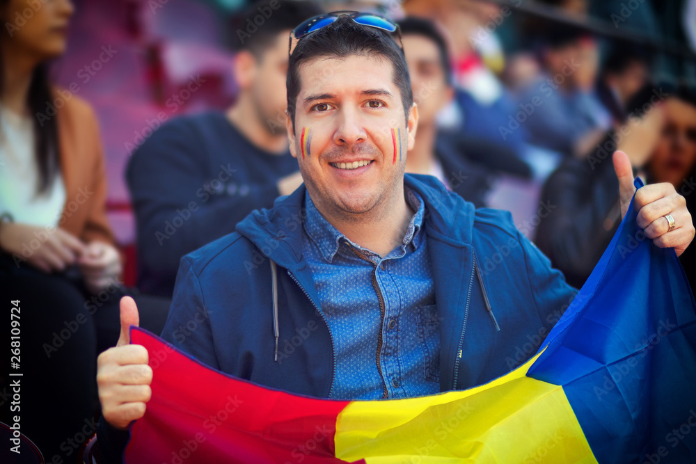 Tableau sur toile Happy supporter holding Romanian national flag in hands at international sport e