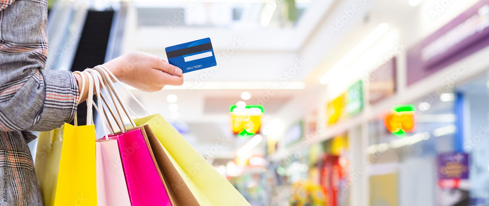 Tableau sur toile Woman Holding Credit Card And Carrying Paper Bags