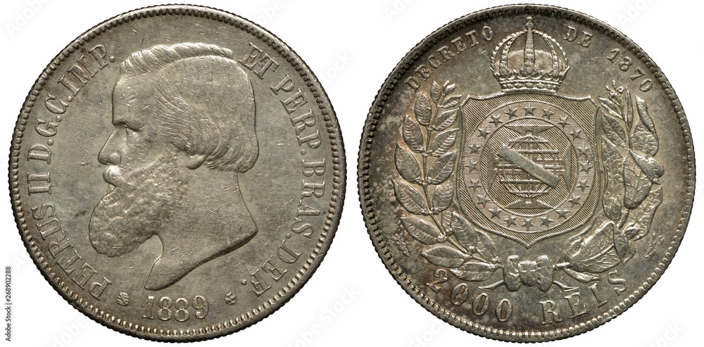 Tableau sur toile Brazil Brazilian silver coin 2 two thousand reis 1889, head of Emperor Pedro II