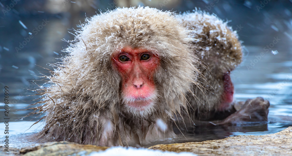 Japanese macaque or snow Japanese monkey with onsen at snow monkey park or Jigokudani Yaen-Koen in Nagano, Japan during the winter season