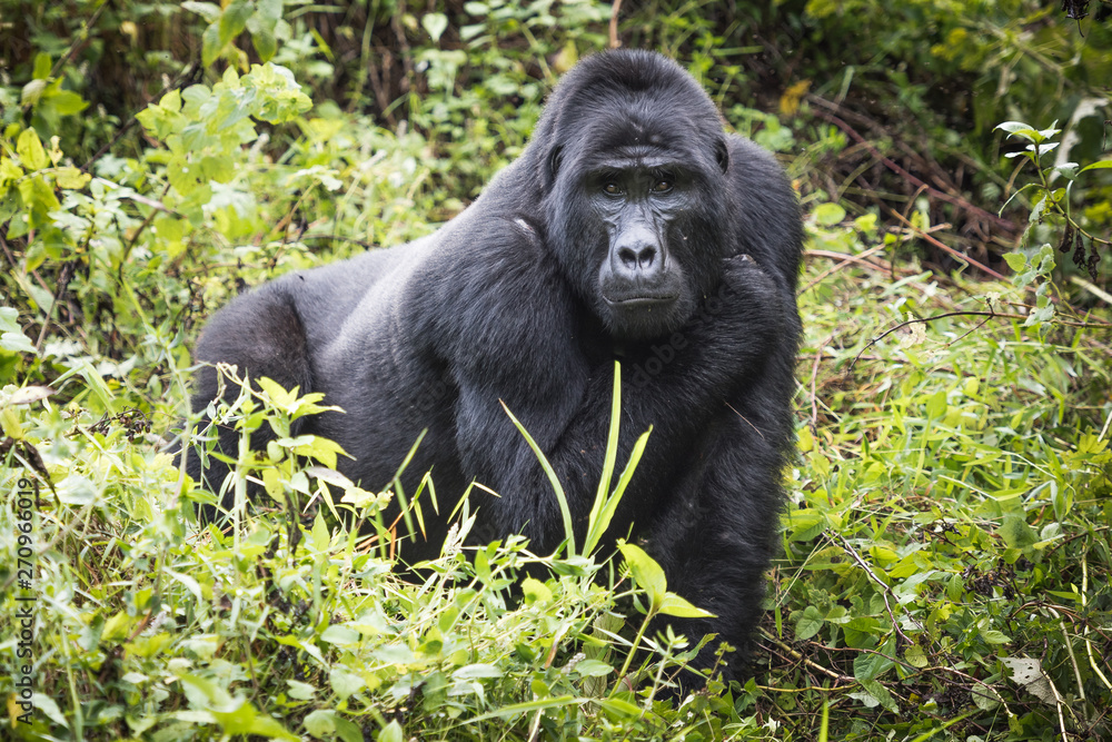 Tableau sur toile Mountain gorilla stands in rich vegetation and looks towards camera in Bwindi Im