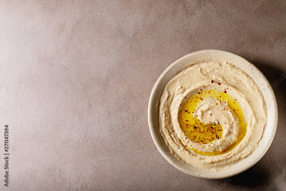 Tableau sur toile Hummus with olive oil in ceramic bowl