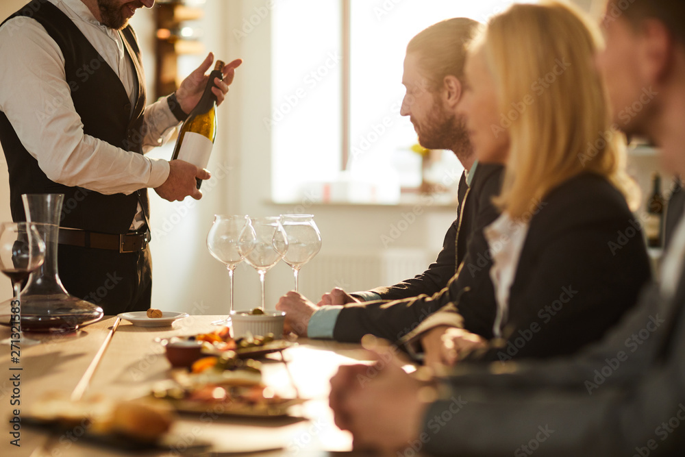 Tableau sur toile Mid section portrait of professional sommelier presenting wine to group of peopl