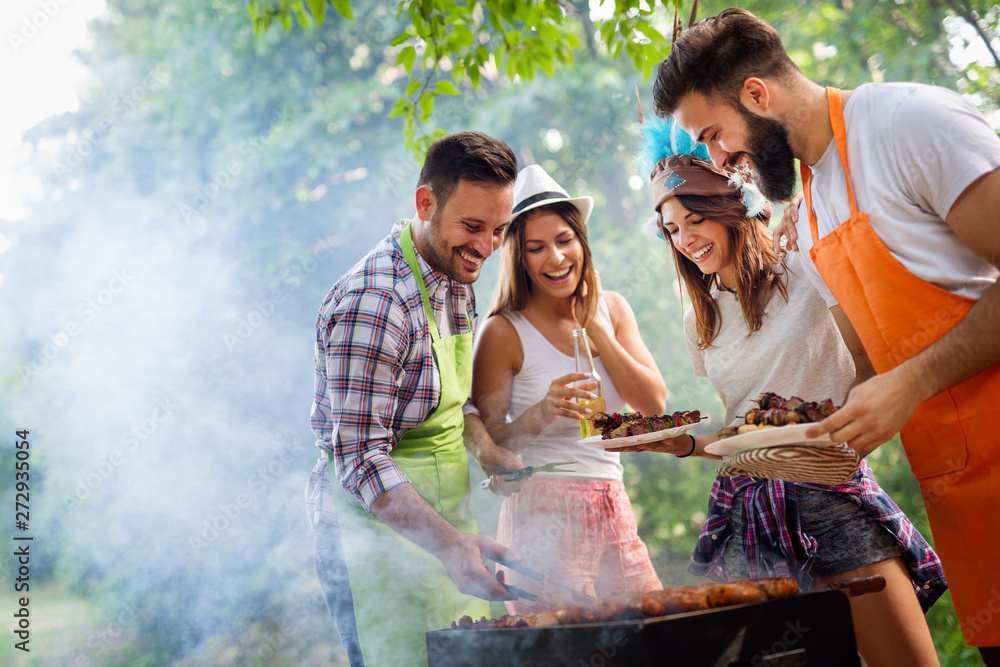 Tableau sur toile Friends making barbecue and having lunch in the nature